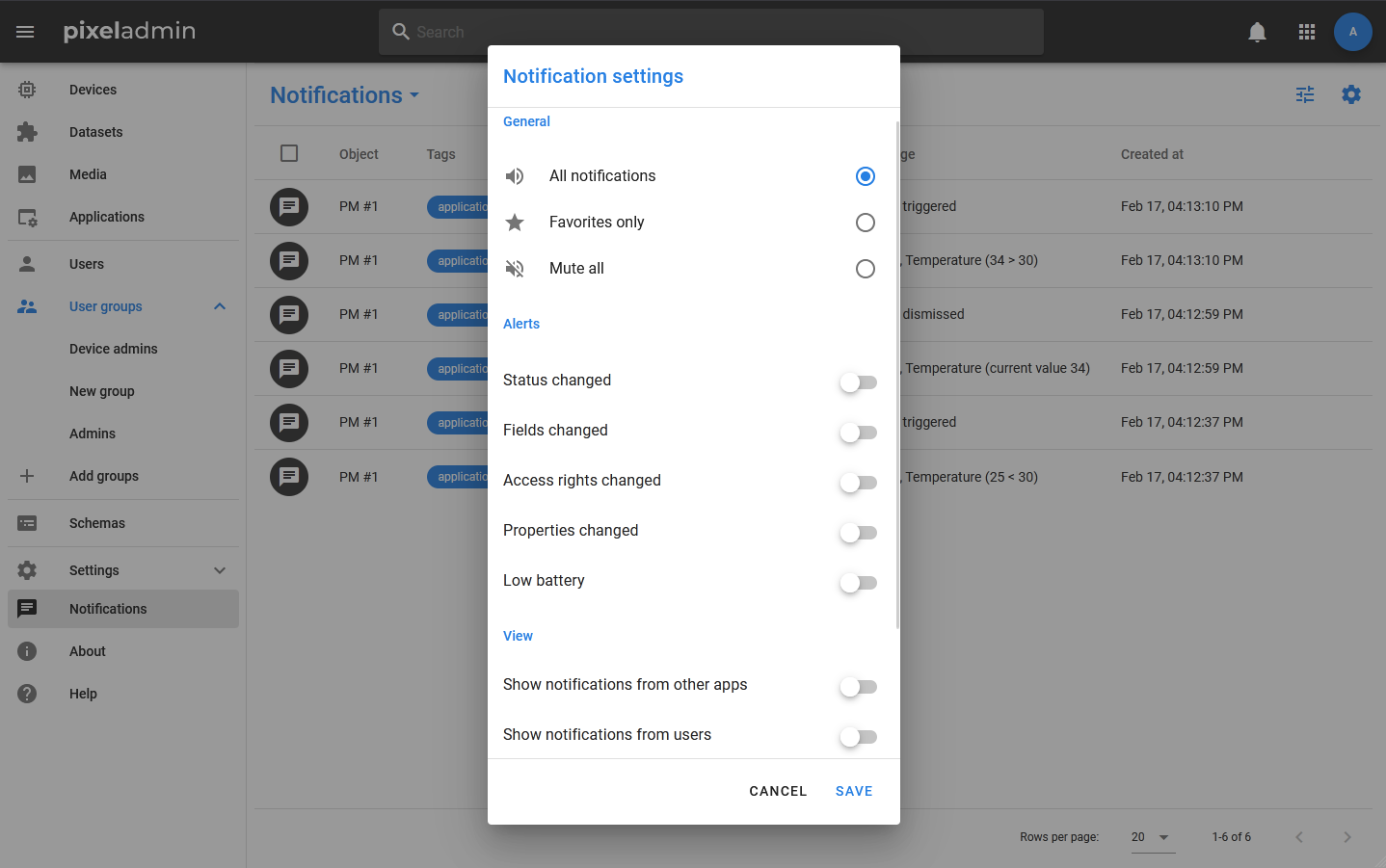 The Pixel Admin application has a notification system (notifications): they can be generated by the system when certain events occur, and can also be sent by users through the application interface.
