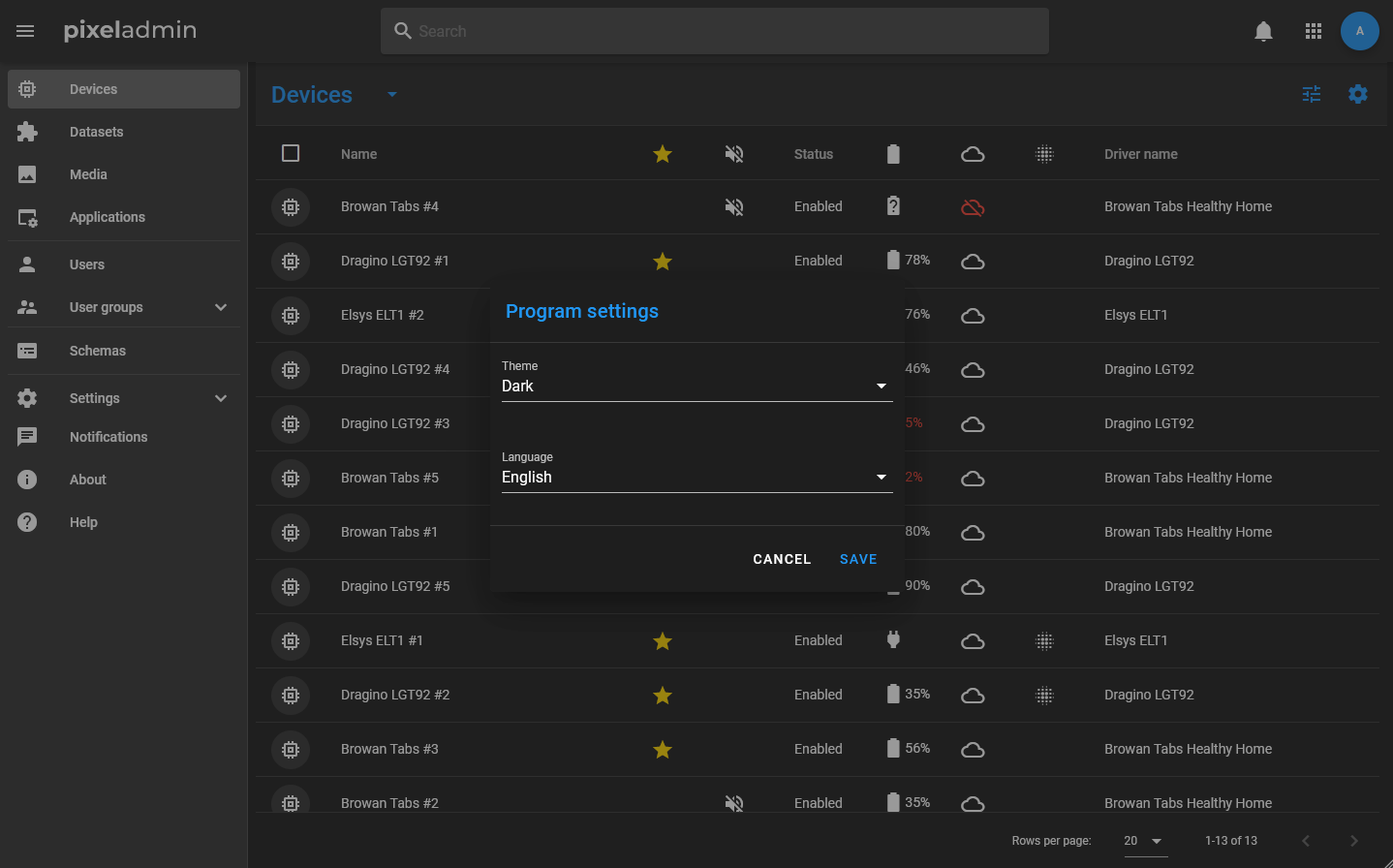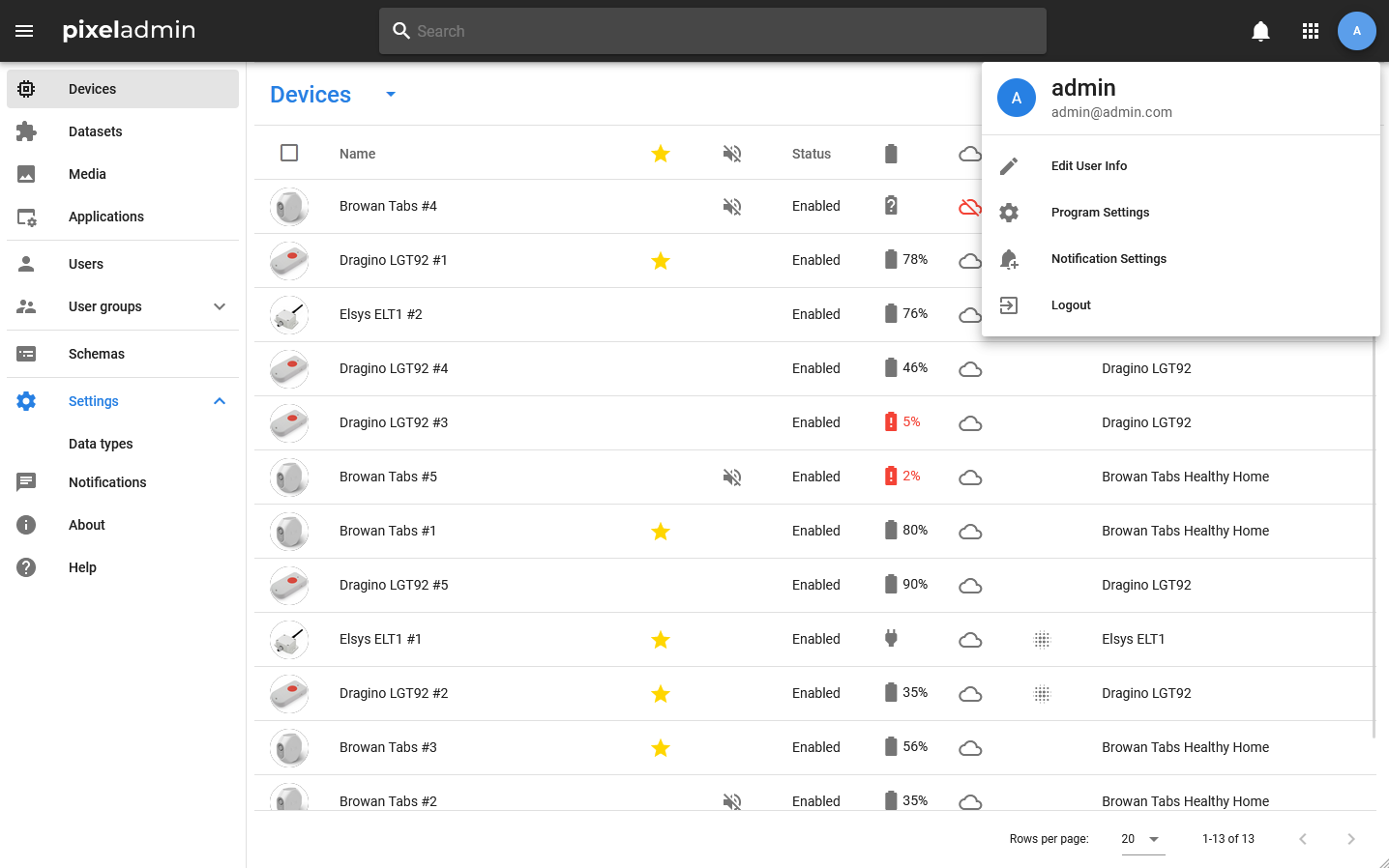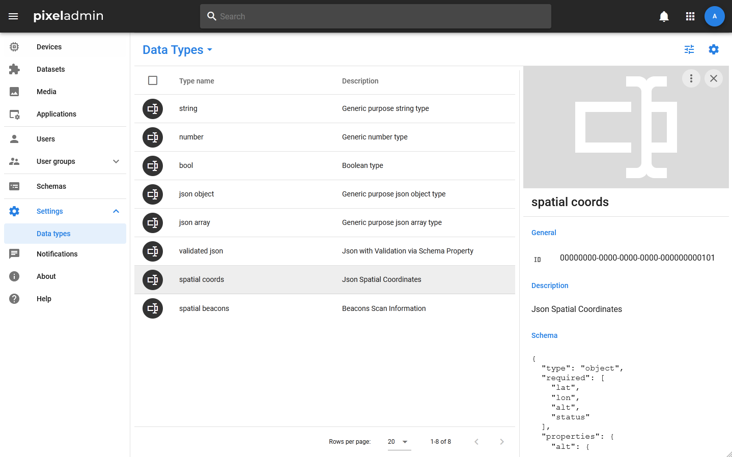 In the Pixel Admin application, you can view, edit, create and delete the data types that Pixel Core works with and the applications that access it. The main types are set in the system when it is installed.