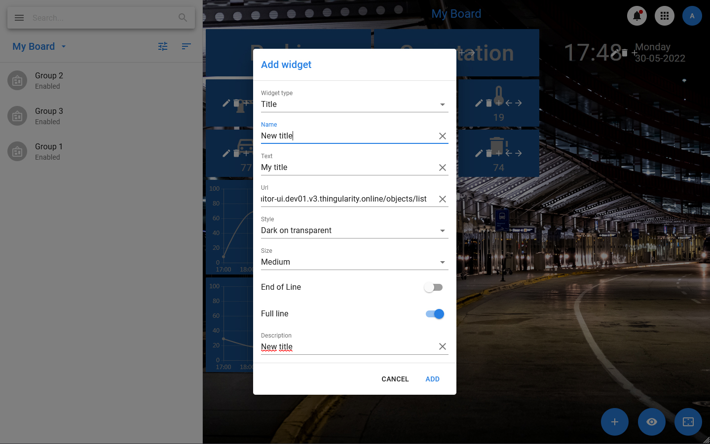 The title widget is designed to display short text entered by the user. The widget can also contain a link to the dashboard.