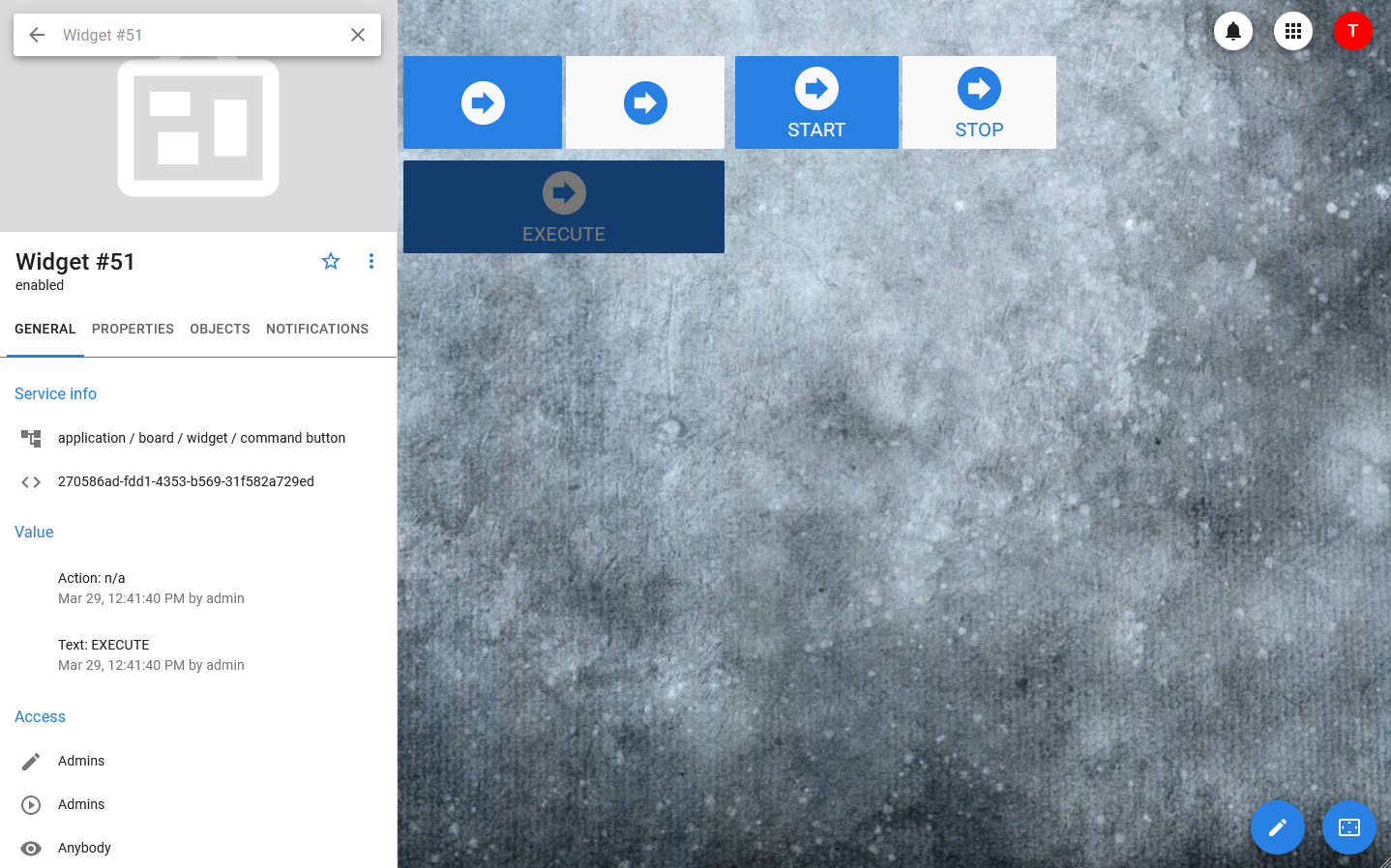 The button is linked to the object control, which is sent when the widget is clicked. It can be used to send controls with parameters, but in this case the parameter values are fixed and they can be changed only through the widget settings, and not through the dashboard itself.
