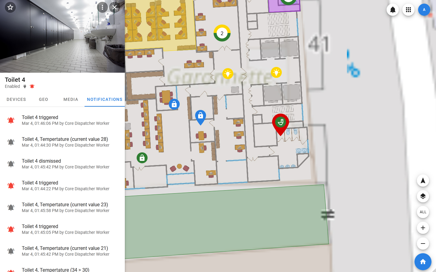 You can view the latest notifications by clicking on the bell in the upper right corner. In the list that opens, you can view all notifications or select a tab with notifications of a specific type, for example, only alarms.